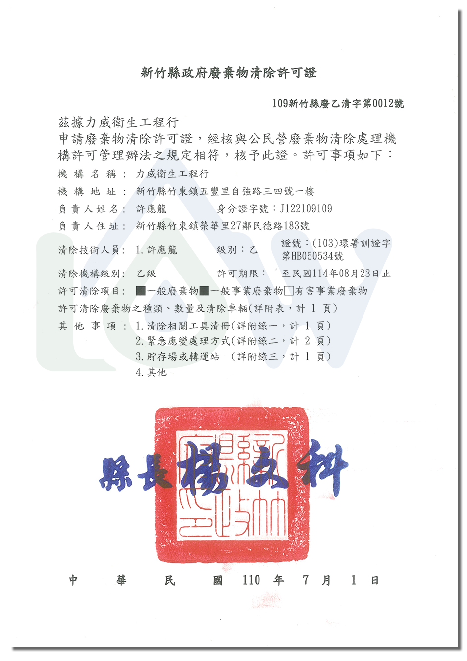 備有專業清除執照 密閉空間主管執照及勞工安全衛生執照